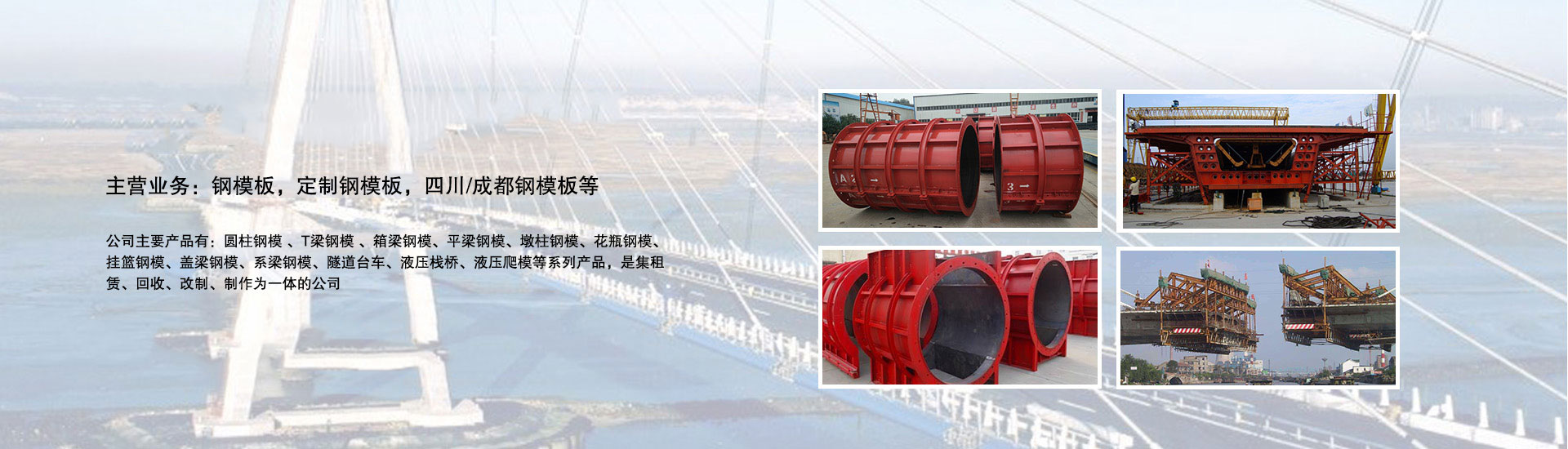 我公司主要產(chǎn)品有:圓柱鋼模 、T梁鋼模 、箱梁鋼模、平梁鋼模、墩柱鋼模、花瓶鋼模、掛籃鋼模、蓋梁鋼模、系梁鋼模、隧道臺(tái)車(chē)、液壓棧橋、液壓爬模等系列產(chǎn)品,是集租賃、回收、改制、制作為一體的公司。